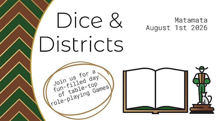 Every couple of months we bring Dice & Districts to a small town in the Waikato, running two sessions for the day. A range of GM's propose games they would like to run and players get the easy part! You just have to show up! (and maybe bring some dice)