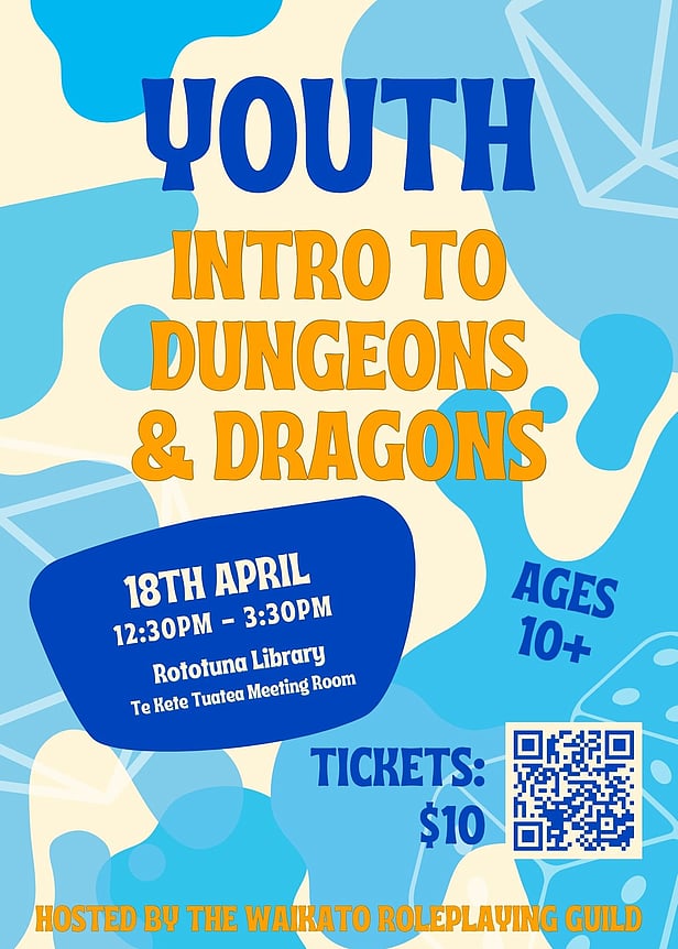 The Waikato Role-Playing Guild is running an Introduction to Dungeons and Dragons hosted in the Te Kete Tuatea Meeting Room at the Rototuna Public Library. This event will give your child the opportunity to get an understanding of the game and hopefully the knowledge to start playing themsleves! They will have the rules explained by an experienced Dungeon Master who’ll then take them on an exciting adventure designed for beginners.